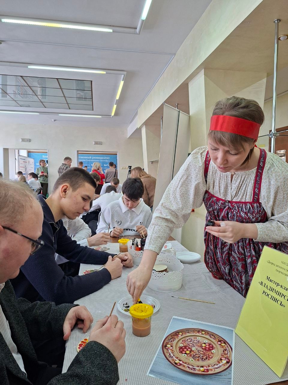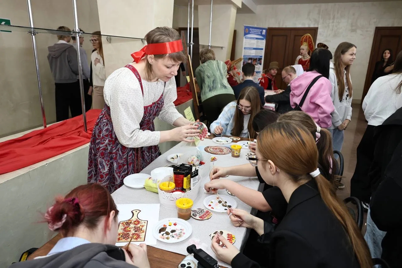 Педагог Дворца Анастасия Вячеславовна Первова провела мастер-класс «Владимирский узор». Участники с увлечением осваивали традиционные мотивы народного искусства, погружаясь в самобытный мир владимирской росписи.